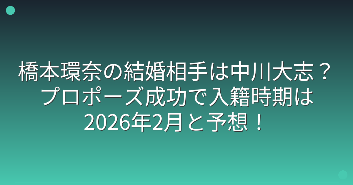 入籍時期については、2026年2月3日の橋本環奈さんの誕生日前後が有力視されており、2025年内または2026年初頭に正式な結婚発表がある可能性が高いと報じられています。