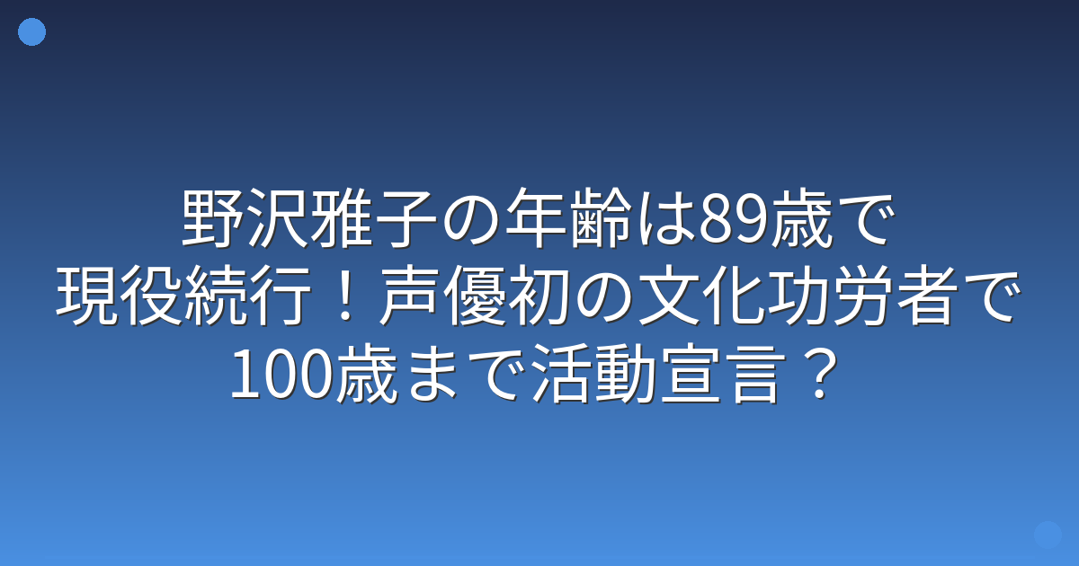 89歳という高齢ながら現役で活躍を続ける野沢雅子さんの年齢や、今後の活動について気になる方も多いのではないでしょうか。