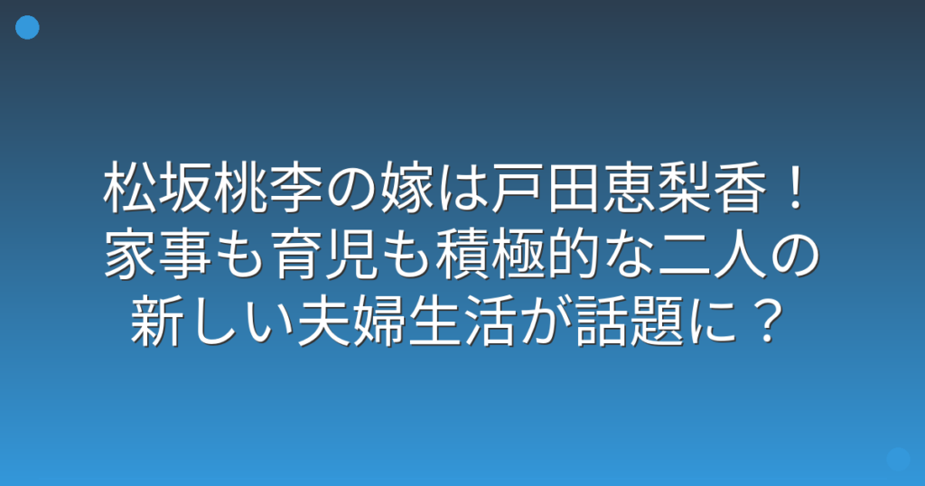 人気俳優の松坂桃李さんと戸田恵梨香さんの結婚は、芸能界でも注目の的となっています。 特に最近では、松坂さんの家庭的な一面や、夫婦で協力して家事や育児をする姿が大きな話題を呼んでいます。 そこで今回は、松坂桃李さんの嫁である戸田恵梨香さんと... -