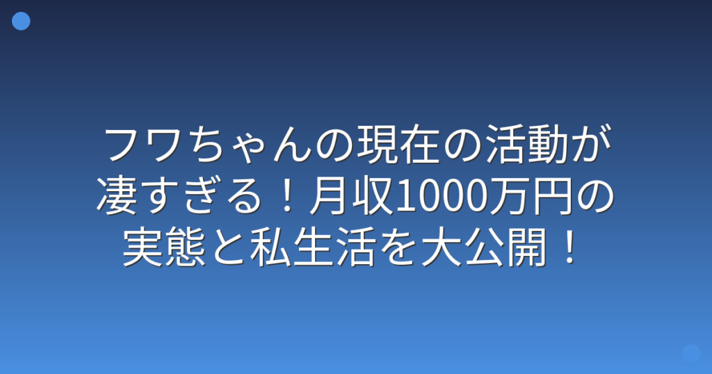 芸能界で大きな注目を集めているフワちゃんさんの近況が、ネット上で大きな話題となっています。 テレビ番組やCMなど、様々な分野で活躍するフワちゃんさんですが、最近の活動内容や収入に注目が集まっているようです。 そこで今回は、フワちゃんさんの現... -