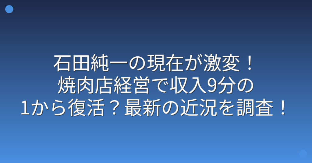 俳優の石田純一さんが、2025年に焼肉店をオープンしたことが大きな話題になっていますね。 コロナ禍での騒動以降、テレビで見かける機会が減っていた石田さんですが、現在はどのような生活を送っているのでしょうか。 そこで今回は、石田純一さんの現在の... -