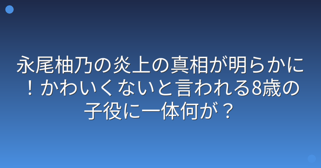 最近、子役の永尾柚乃さんに関する「炎上」が話題になっています。 8歳という若さながら、大人びた話し方や高い演技力で注目を集める永尾柚乃さんですが、一部で「かわいくない」「見たくない」といった声も上がっているようです。 そこで今回は、永尾柚乃...