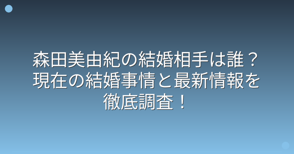 NHKのアナウンサーとして長年活躍されている森田美由紀さんの結婚相手について、多くの方が関心を持たれていますね。 落ち着いた語り口と知的な雰囲気で人気の森田美由紀さんですが、プライベートな情報はあまり公開されていないため、結婚しているのか、... -